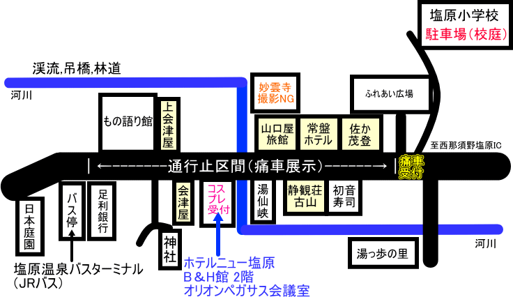 | ■会場付近MAP(グーグルマップ)(住所:栃木県那須塩原市塩原704 付近) ・東北自動車道「西那須野I.C」から25分 ・見学される方の無料駐車場は、塩原小学校校庭です。(4月22日9時〜17時まで駐車可) ・小学校から痛車展示区間までは徒歩5分くらいです。 ・エントリー車の待ち合わせには「湯っ歩の里 駐車場」をご利用下さい。 ・車両交通規制(歩行者天国)の時間は、12時〜15時です。 【会場地図】 ![]() 【展示スペースのご案内】 ![]() 【MEMO】 第1回痛車ルDのレポートが「痛G vol.10」に掲載されました。 今回の痛車イベントは地元メディアの取材が入りますので、ご了承の上ご来場下さい。 第1回痛車ルDの様子はこちらから。 |